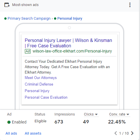 Wilson & Kinsman is a law firm specializing in personal injury & criminal defense. They were not happy with their last PPC manager, so they had me run some ads for them. I helped them generate 20 leads in their 1st month.